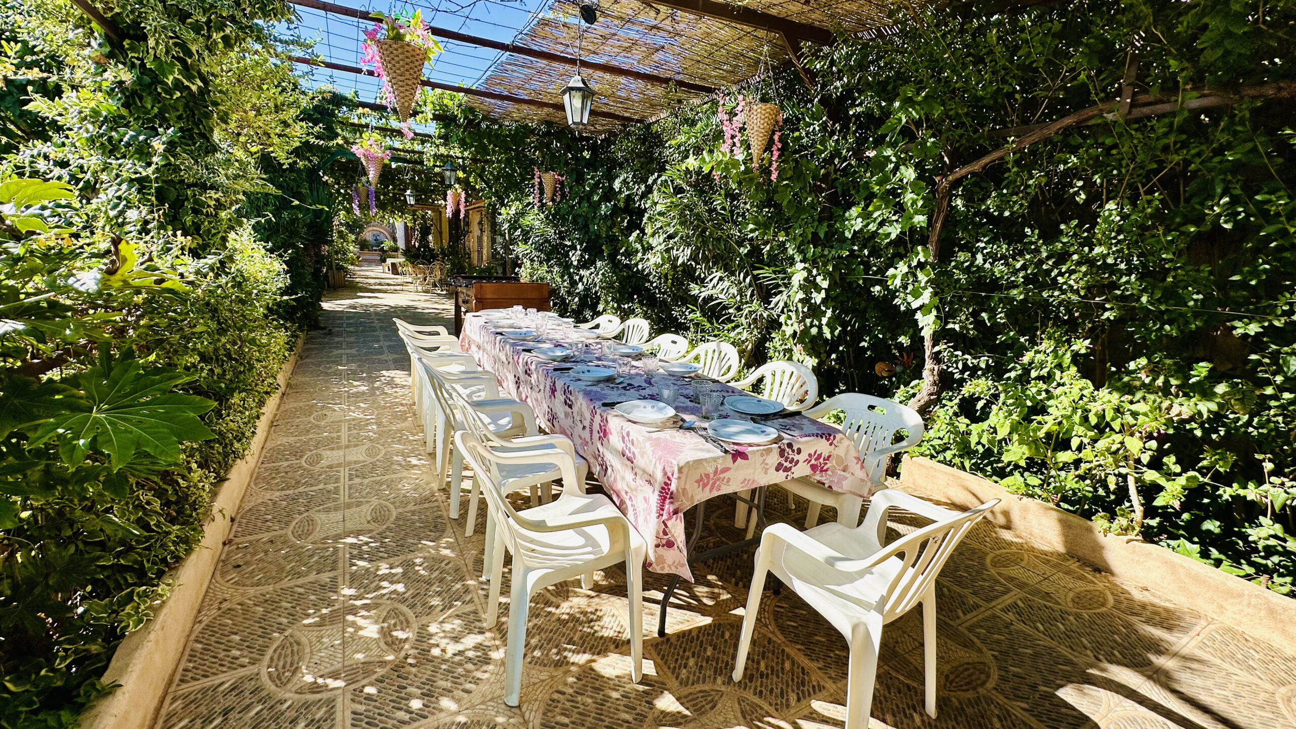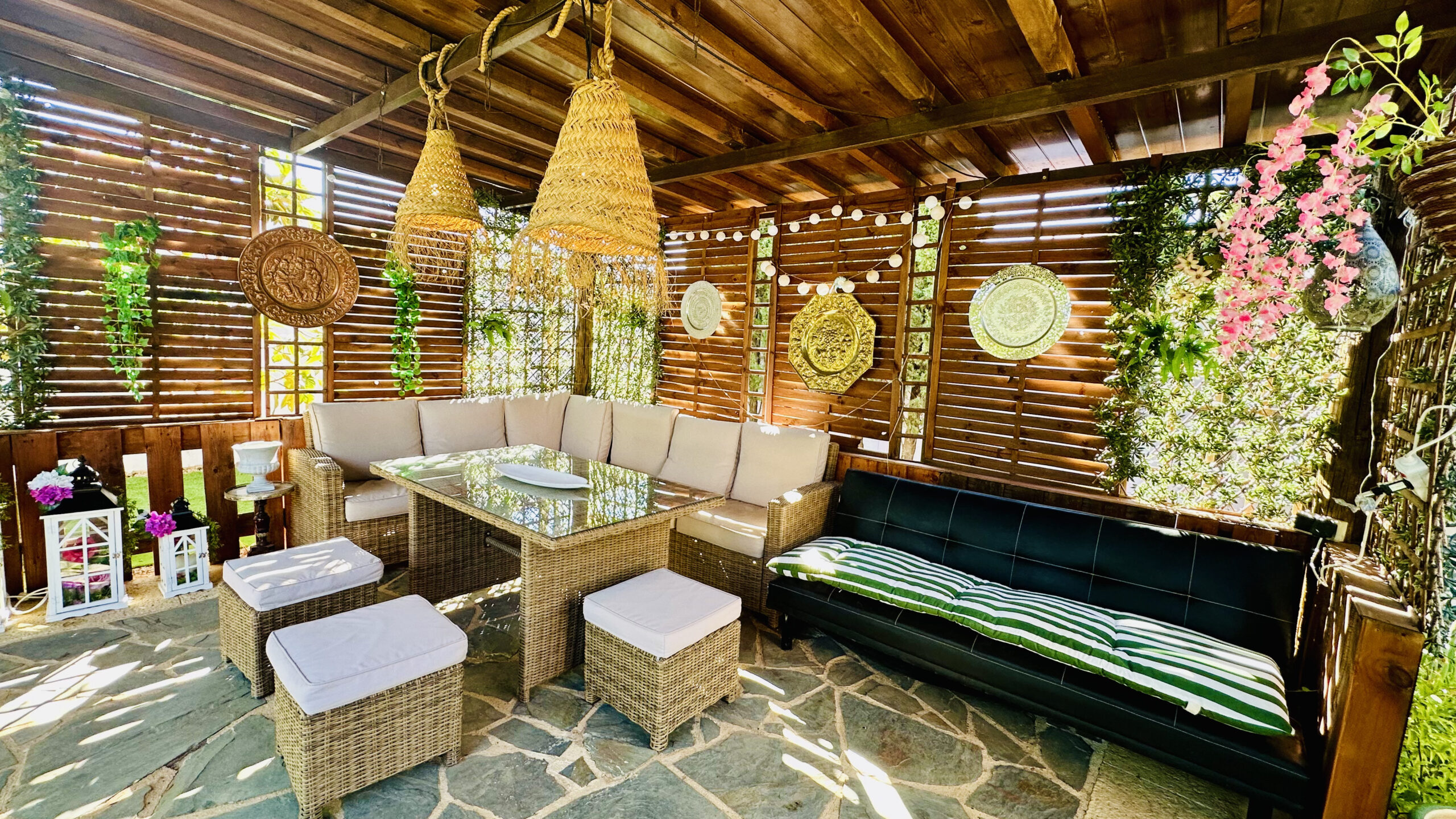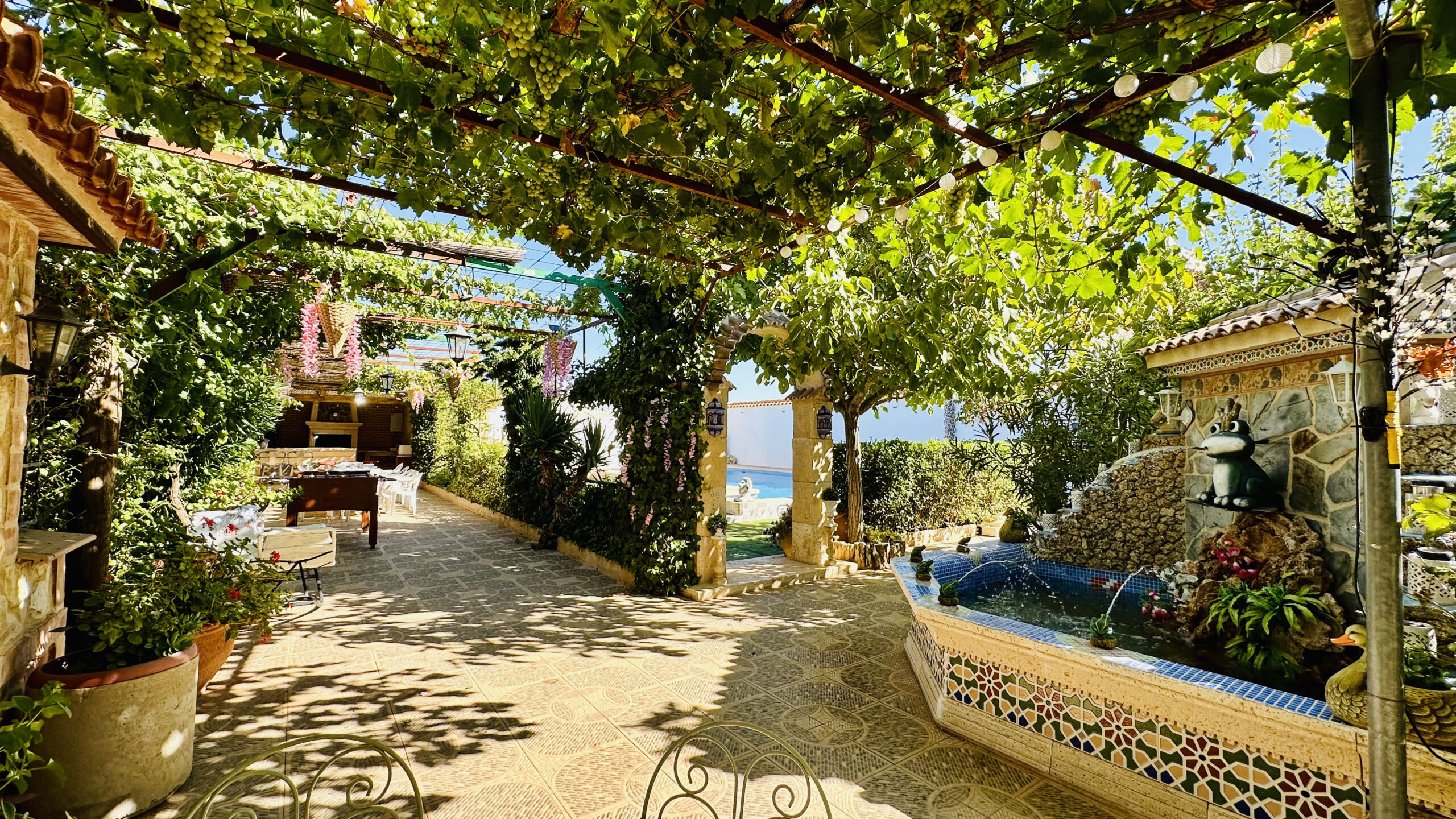 La finca cuenta con una gran zona exterior con barbacoa, horno, nevera, mesas, sillas y hasta futbolín. Un espacio perfecto para comer, pasar el día y disfrutar al aire libre.
