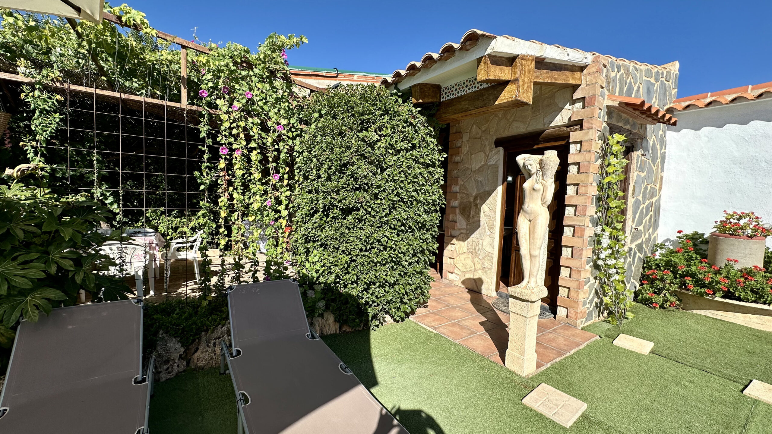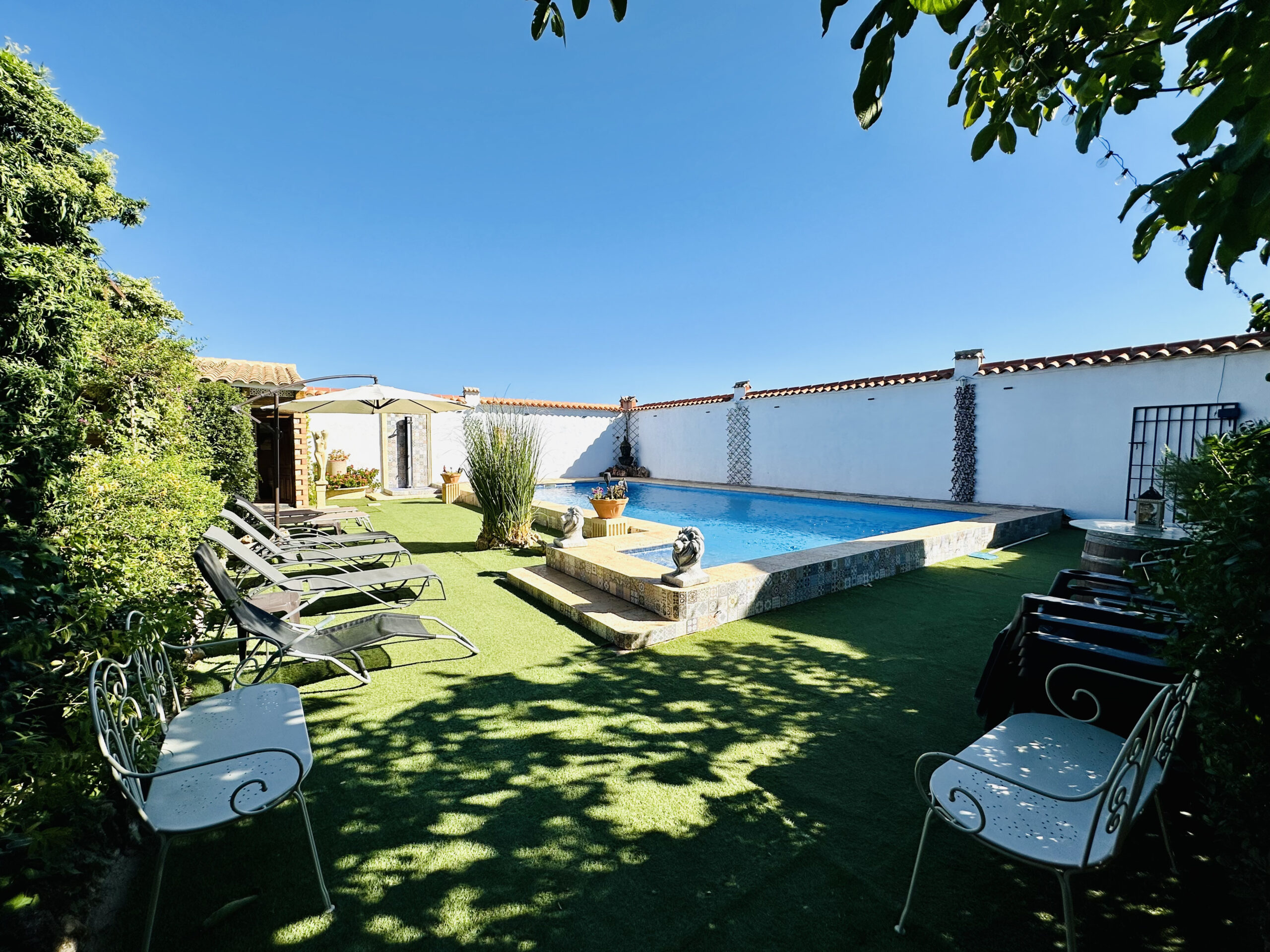 La piscina, de 12 metros, tiene distintas profundidades y escaleras cómodas. Junto a ella, una zona chill out con sofás, sombra, césped y tumbonas, perfecta para relajarte con vistas al campo. También cuenta con un baño exterior y ducha.